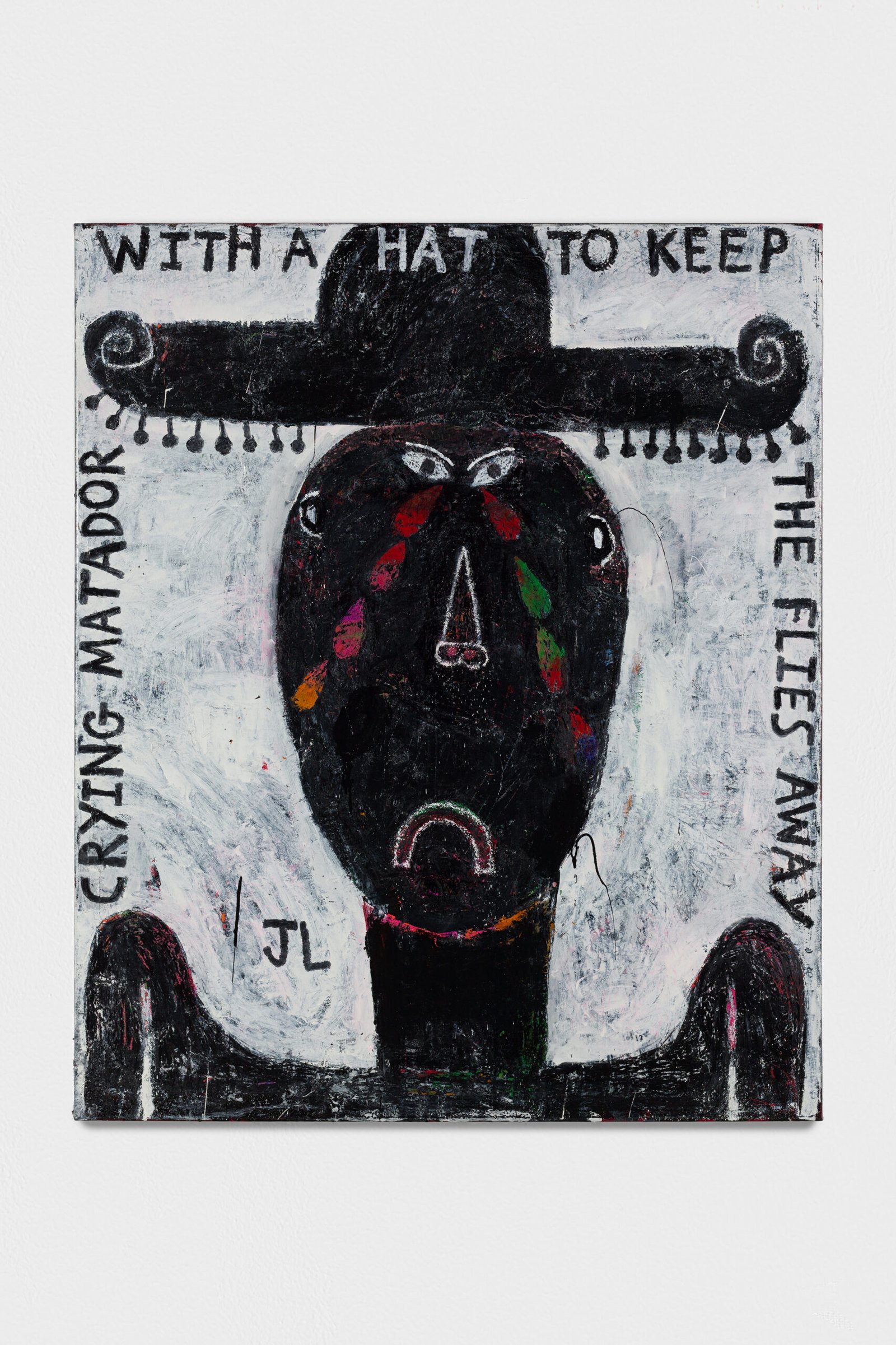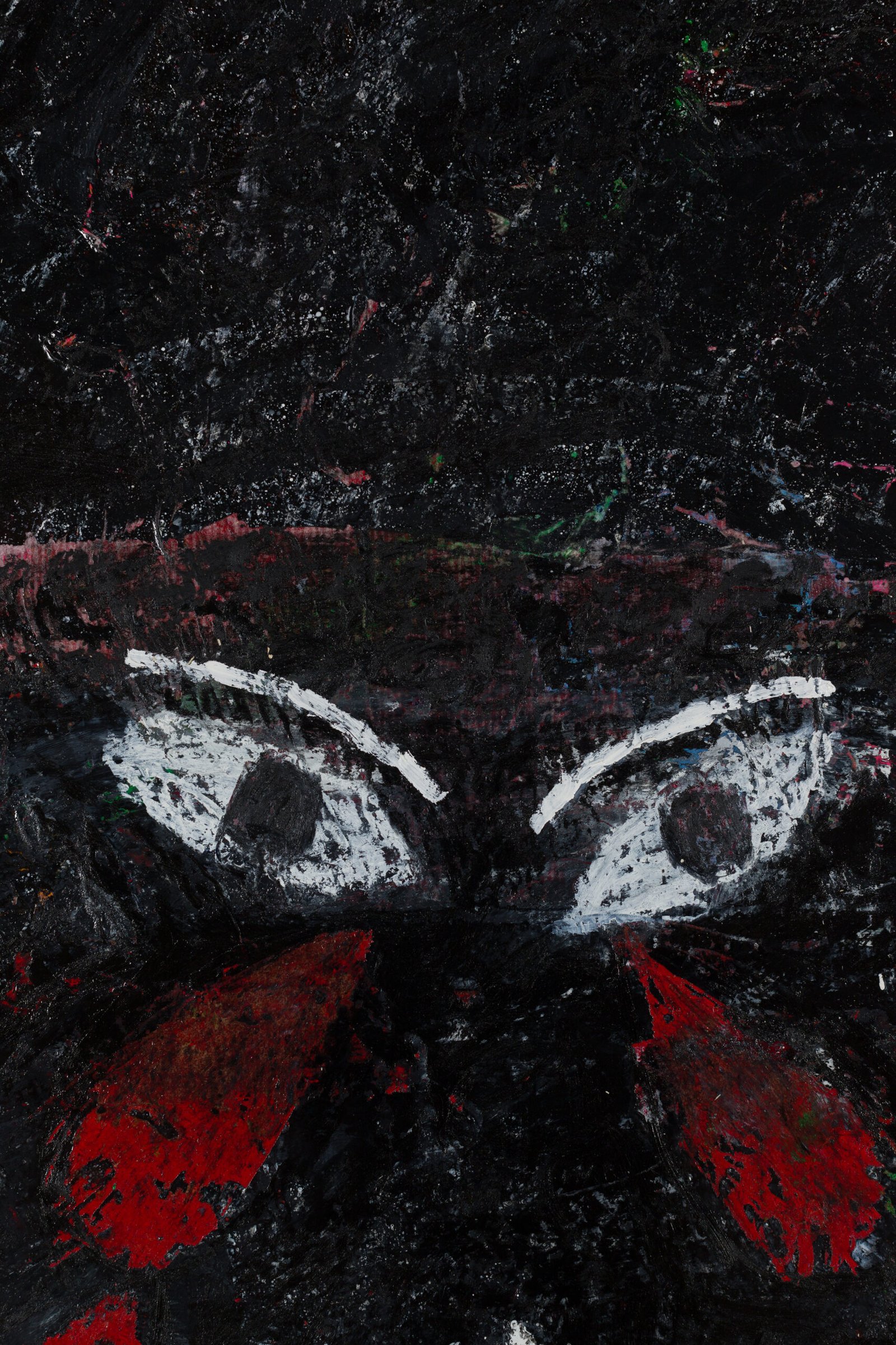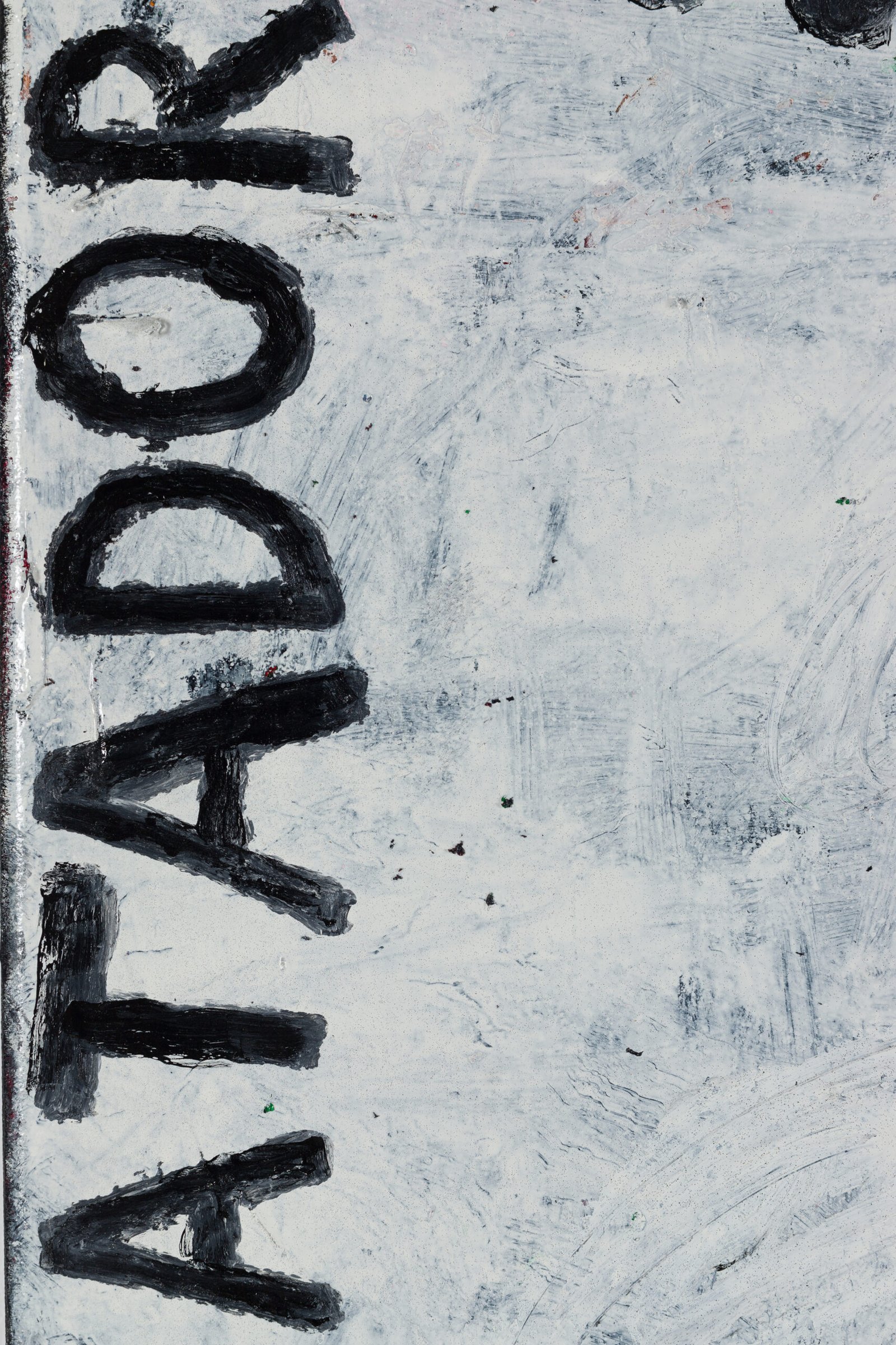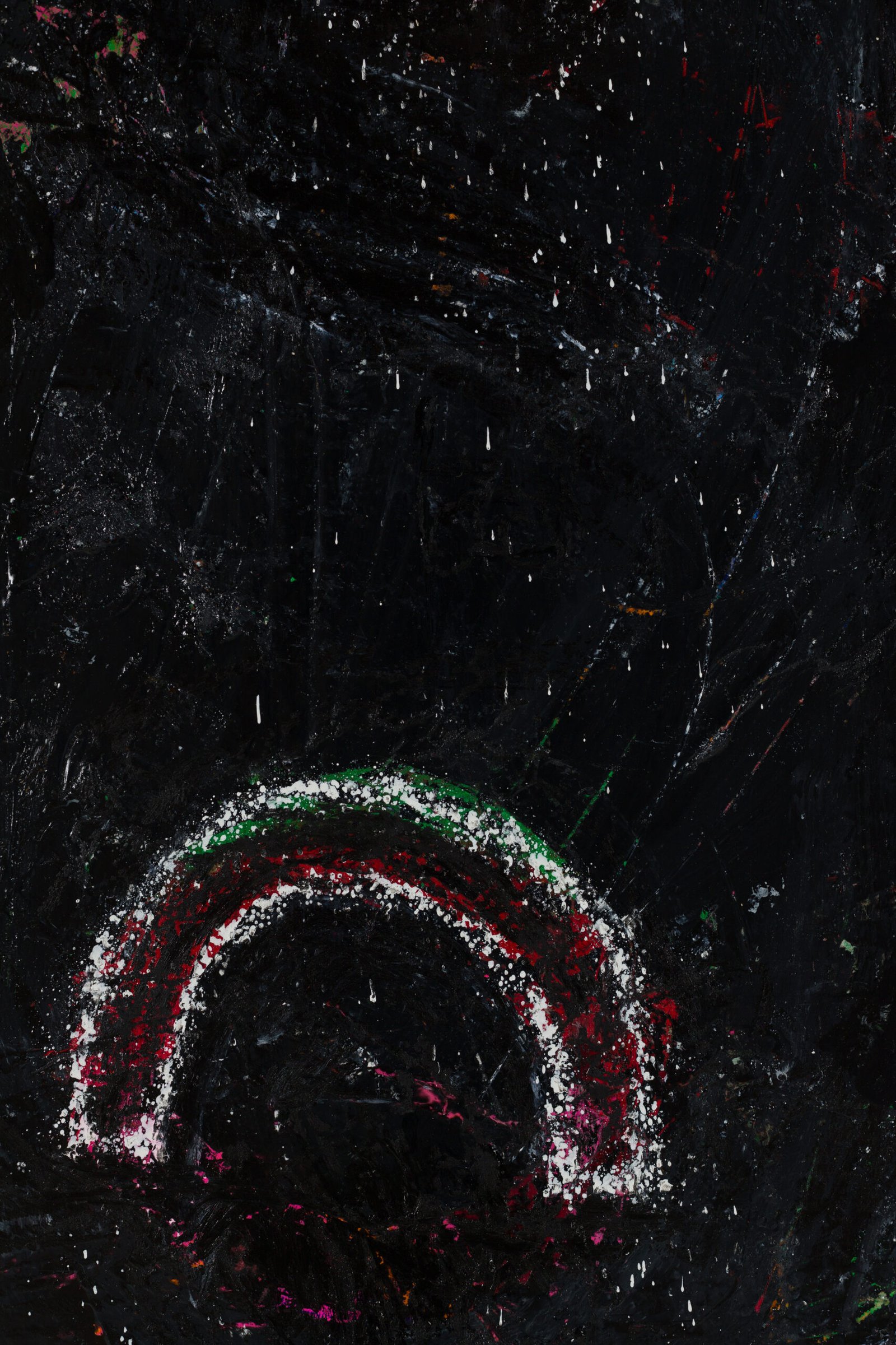 Oilsticks, oil paint, enamel paint, spray paint and paper pasted on canvas