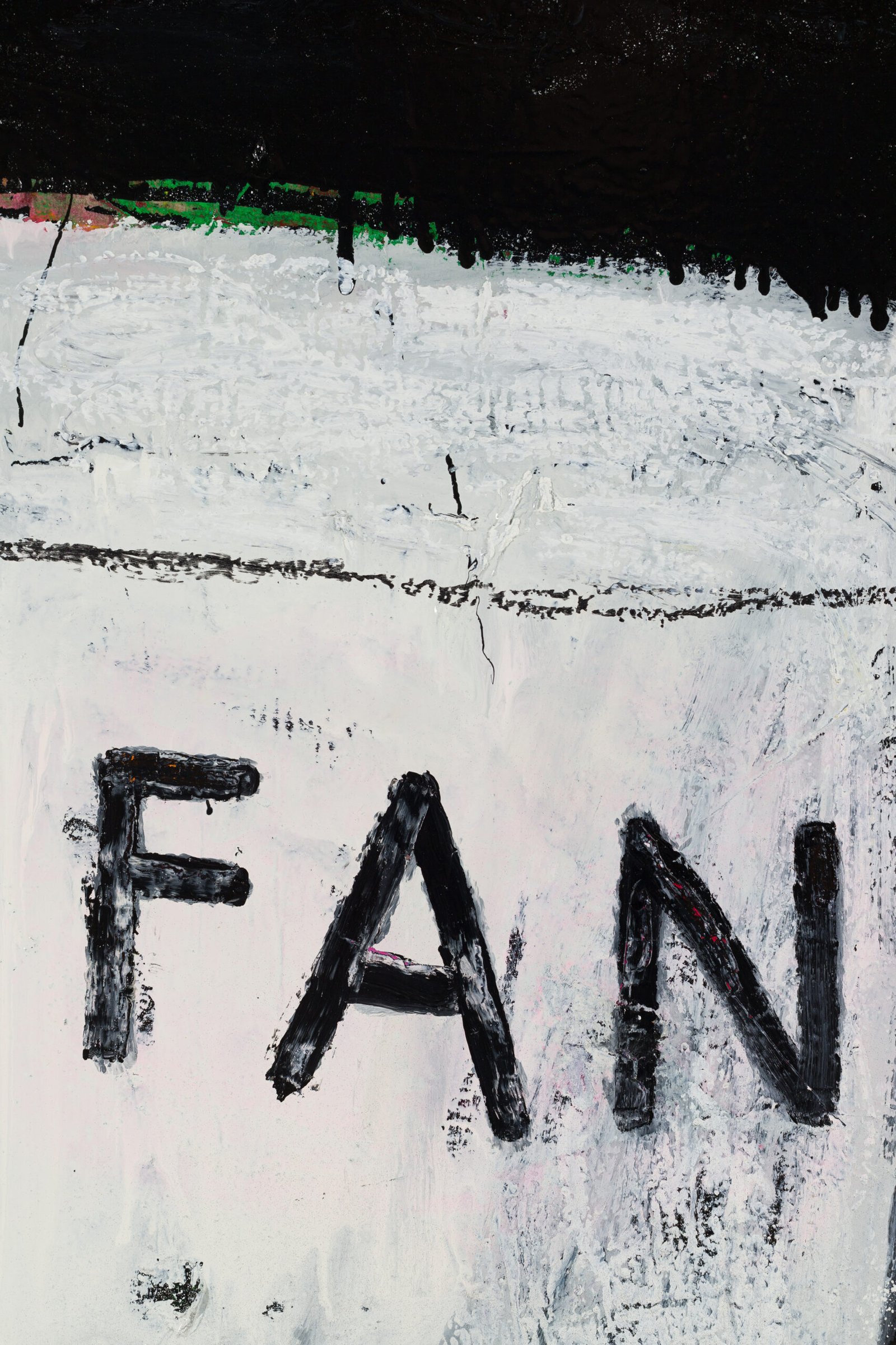 Oilsticks, oil paint, enamel paint, spray paint and paper pasted on canvas