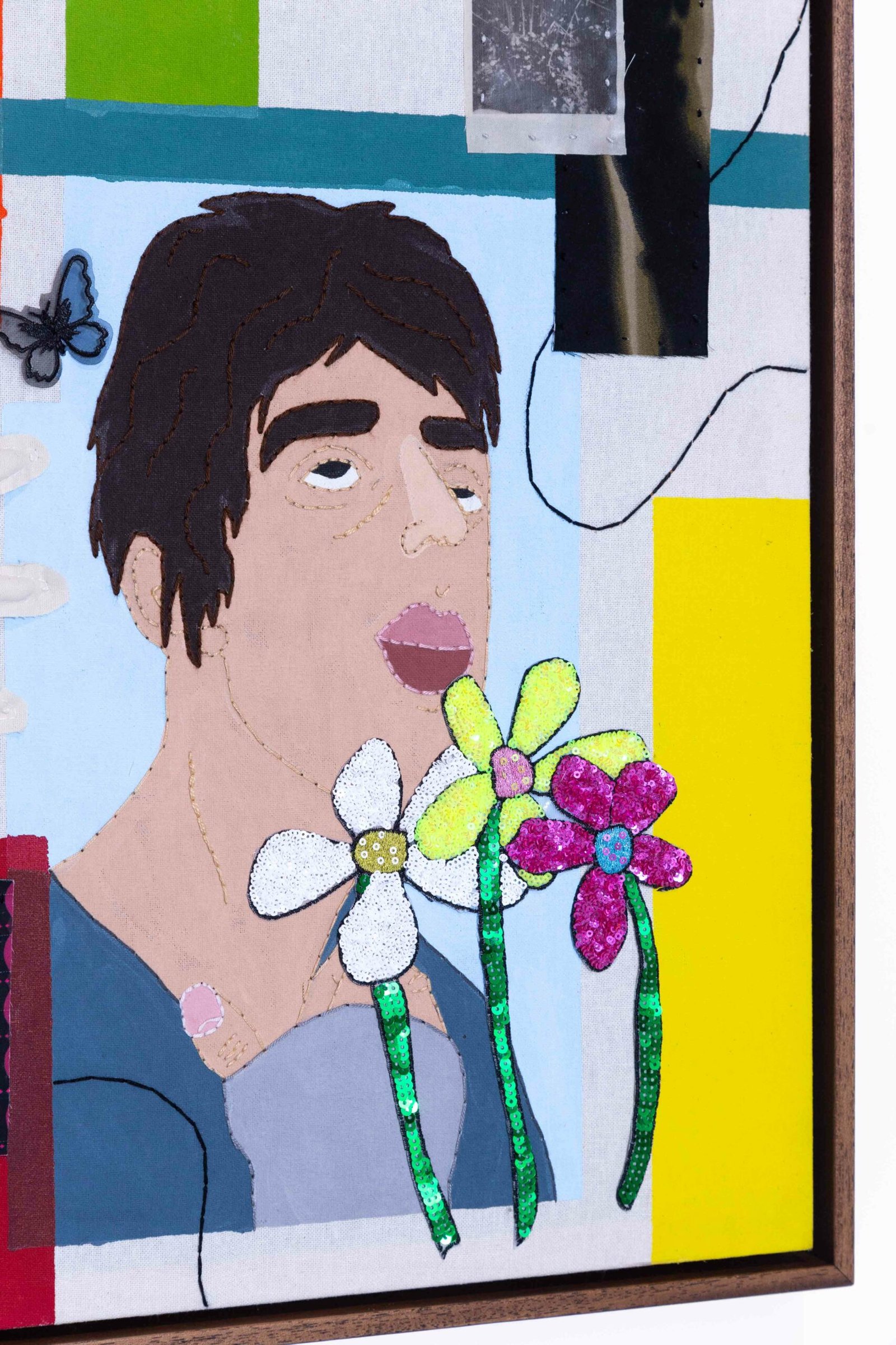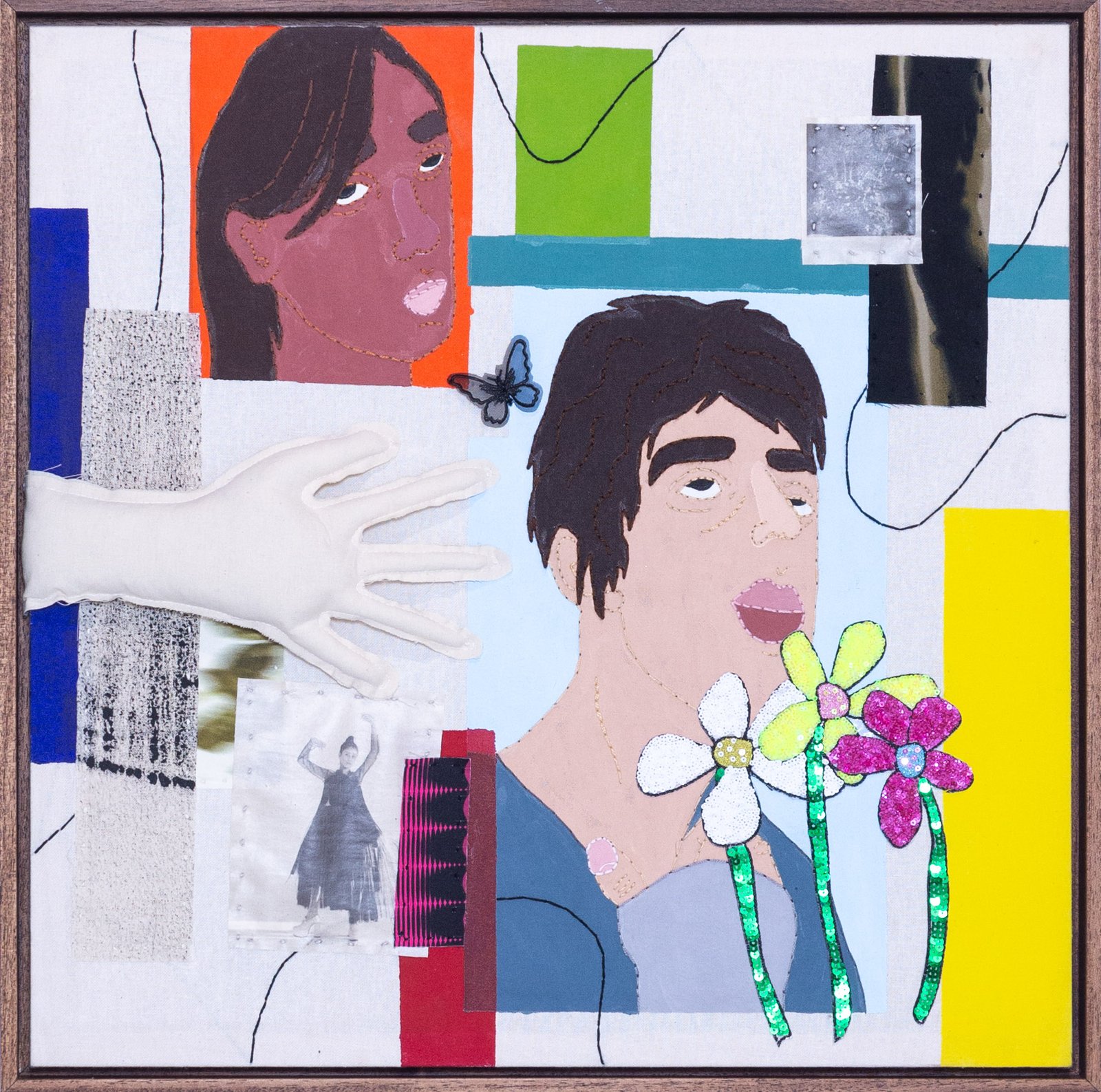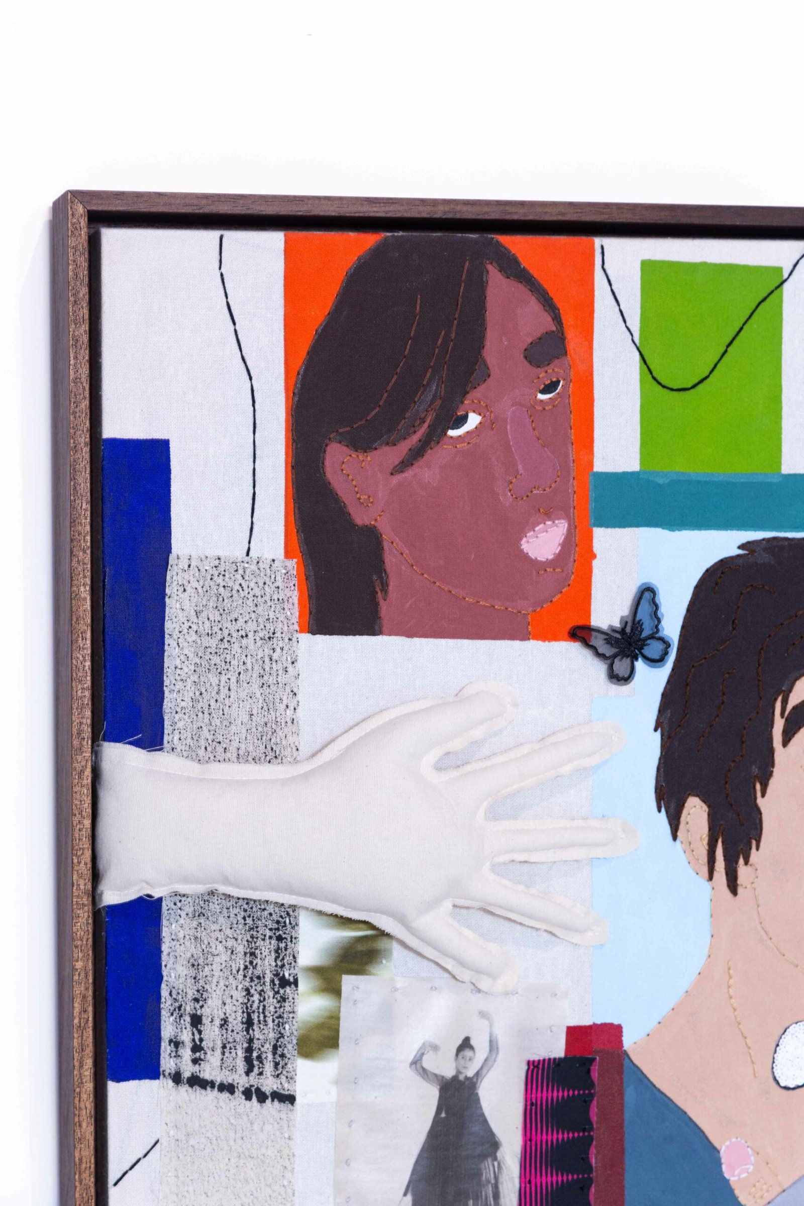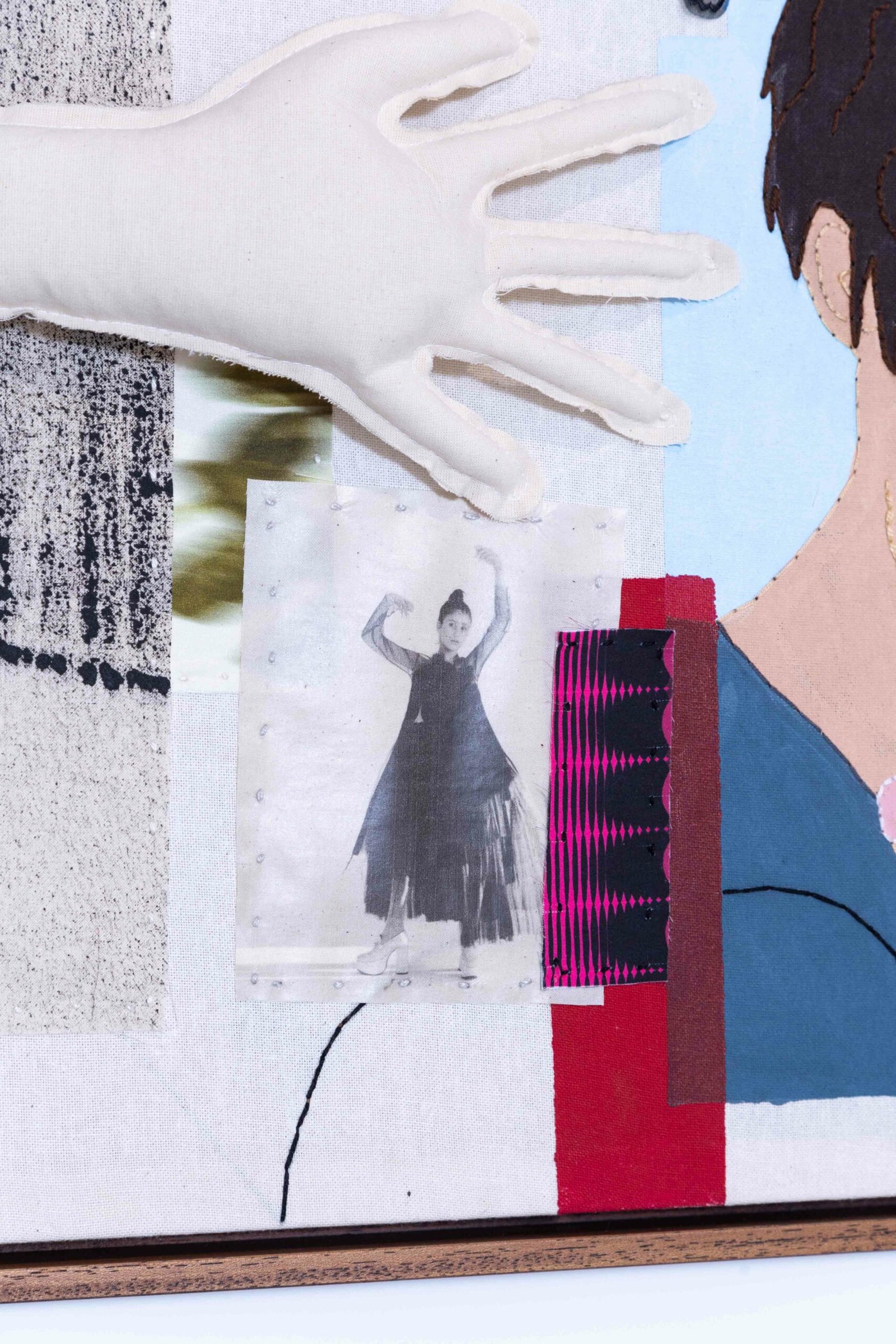 Collage-like acrylic painting, embroidery, printed photos on fabric, and reliefs made with batting and fabric.