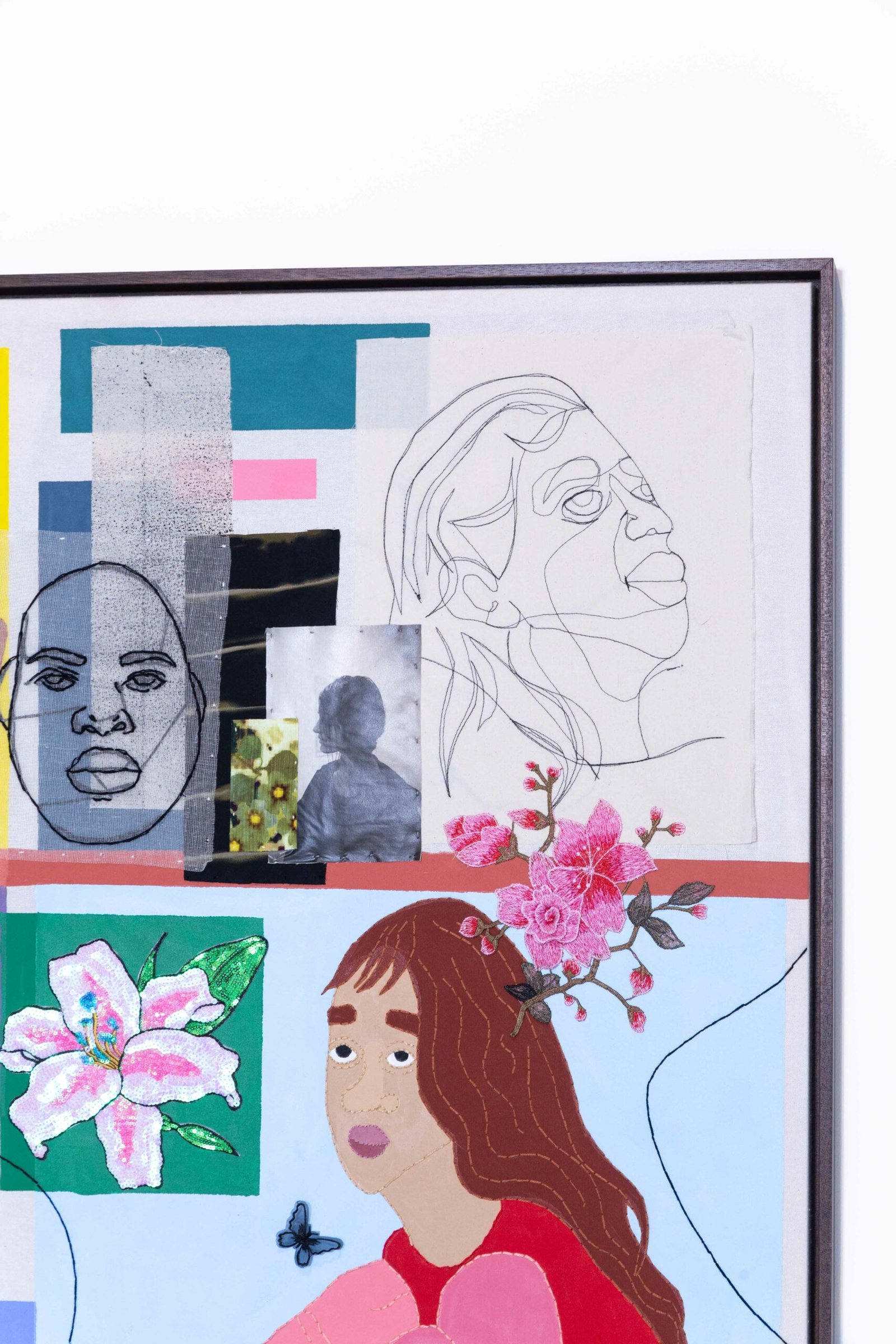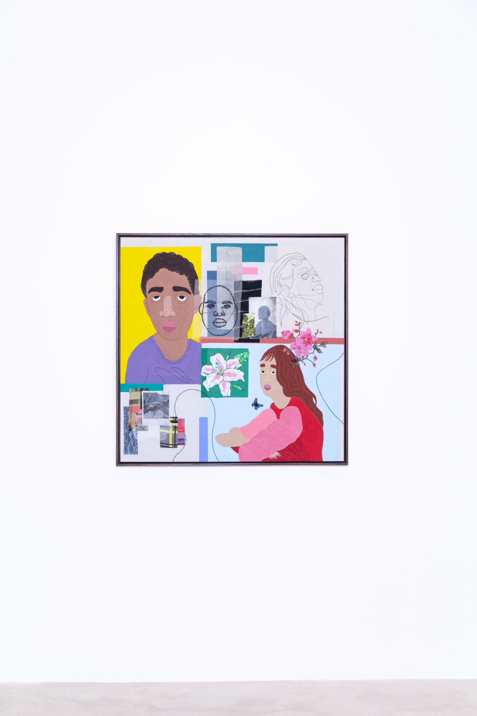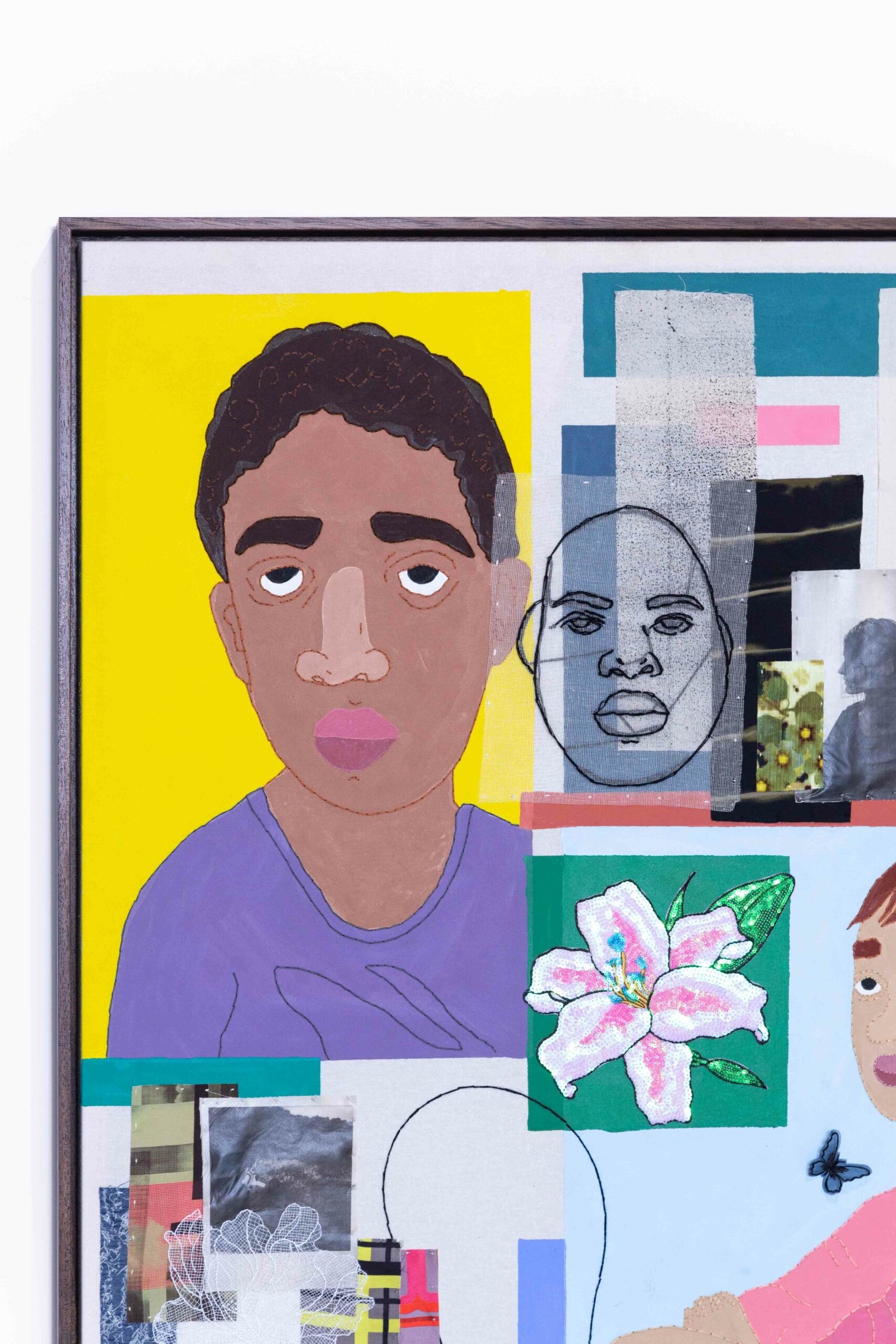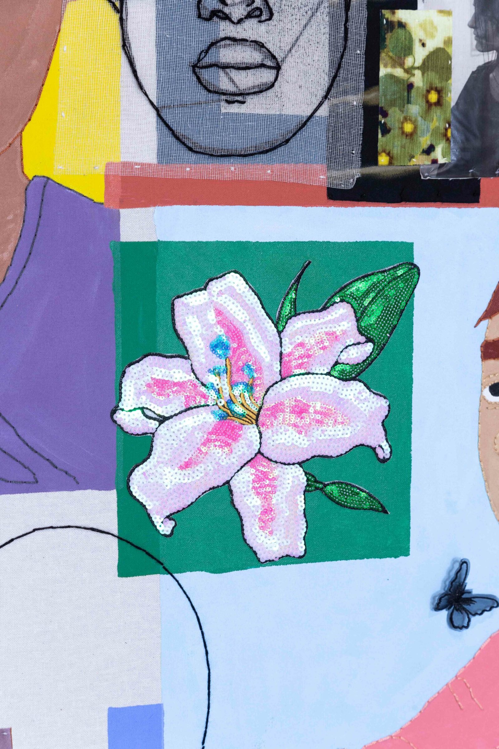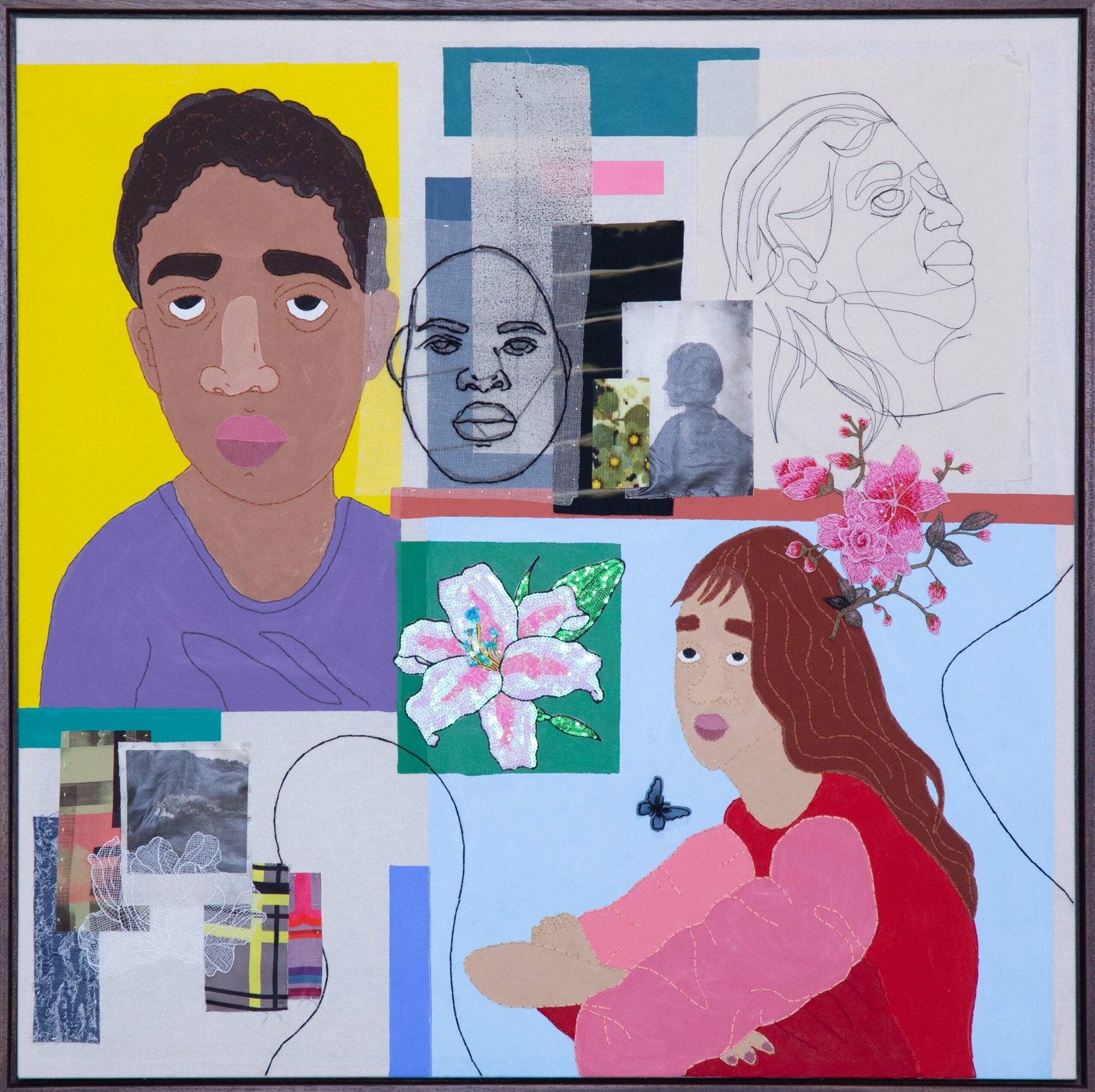 Collage-like acrylic painting, embroidery, printed photos on fabric, and reliefs made with batting and fabric.