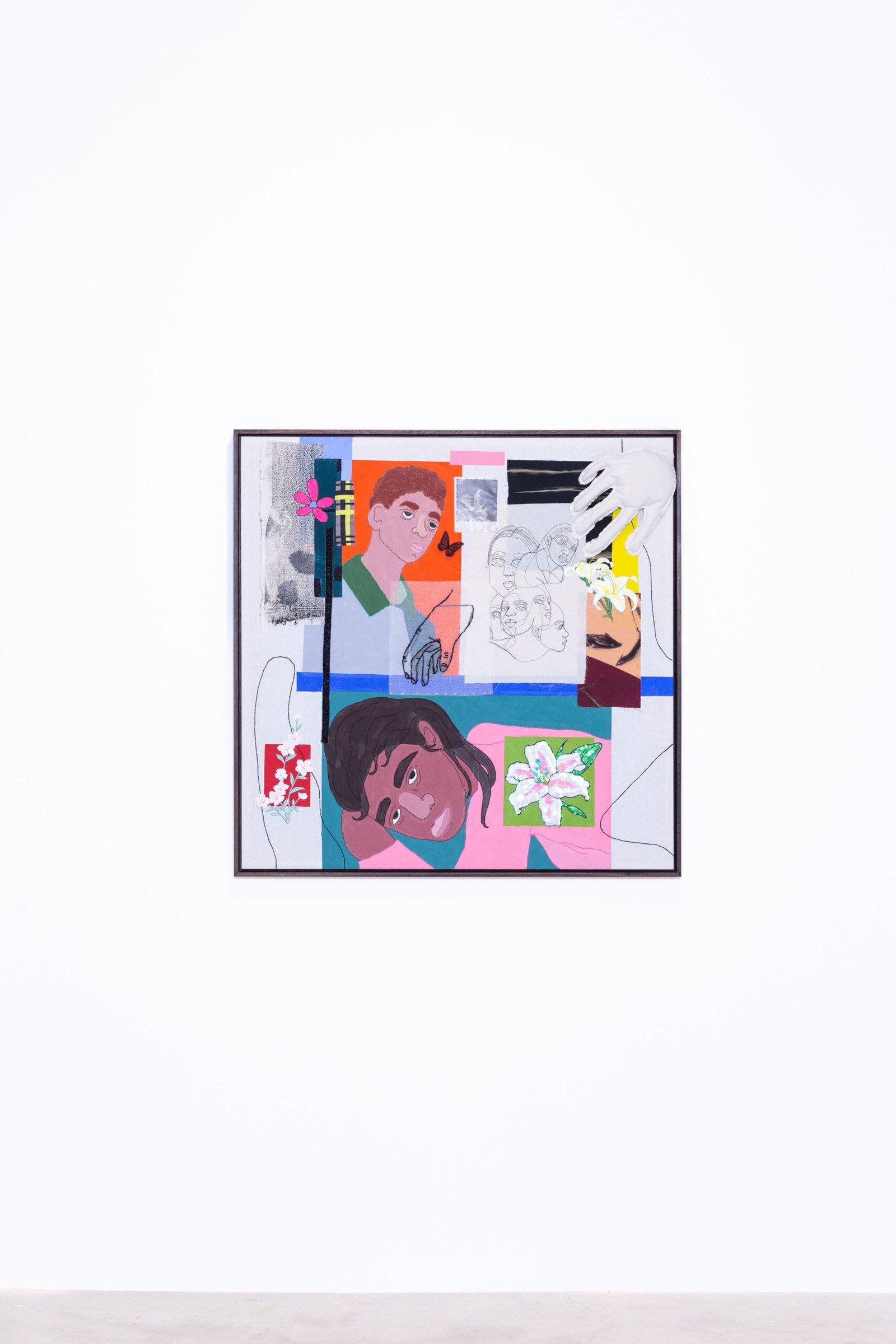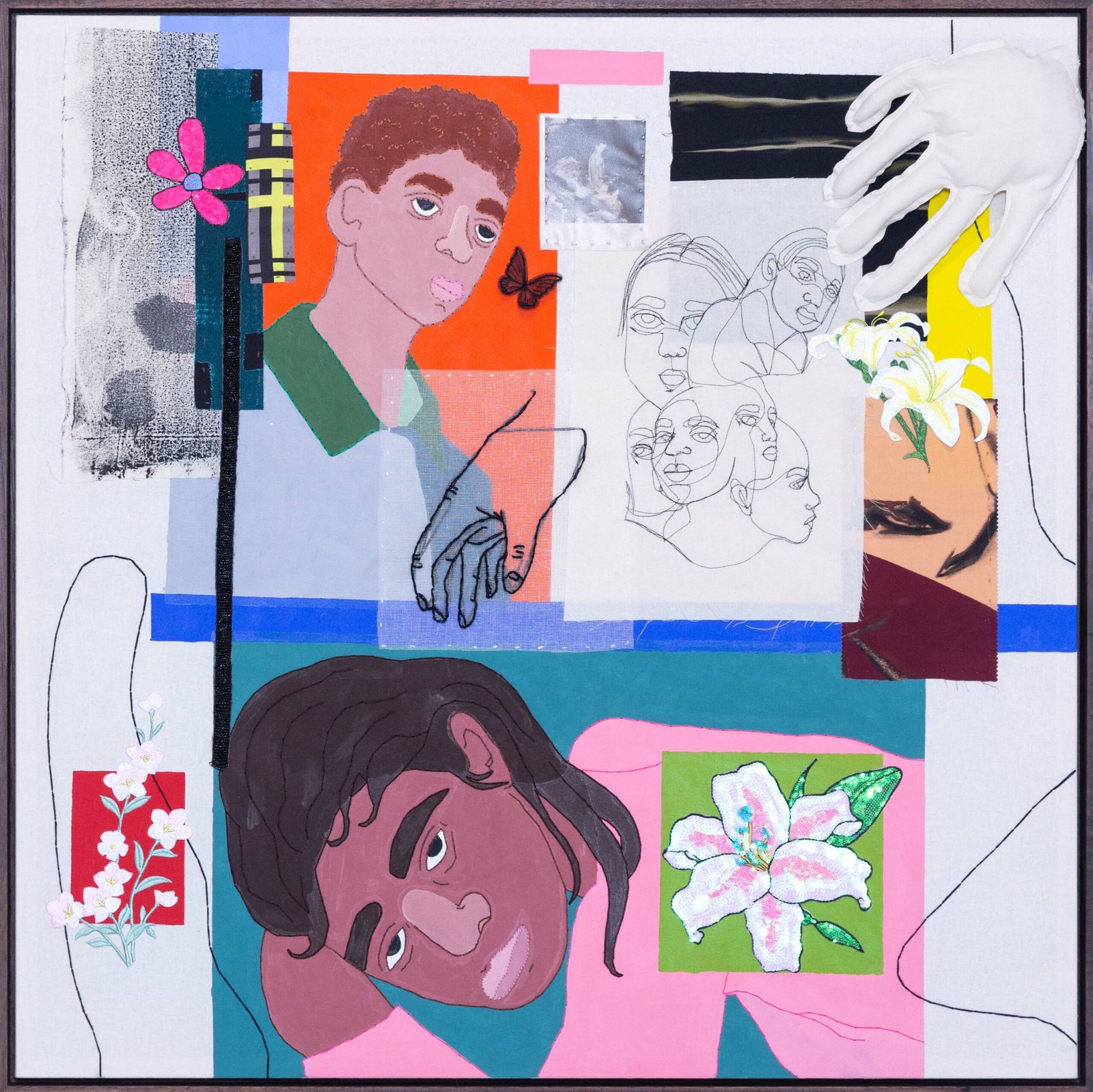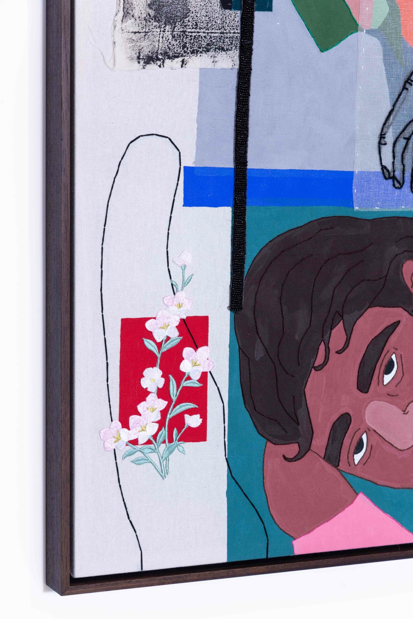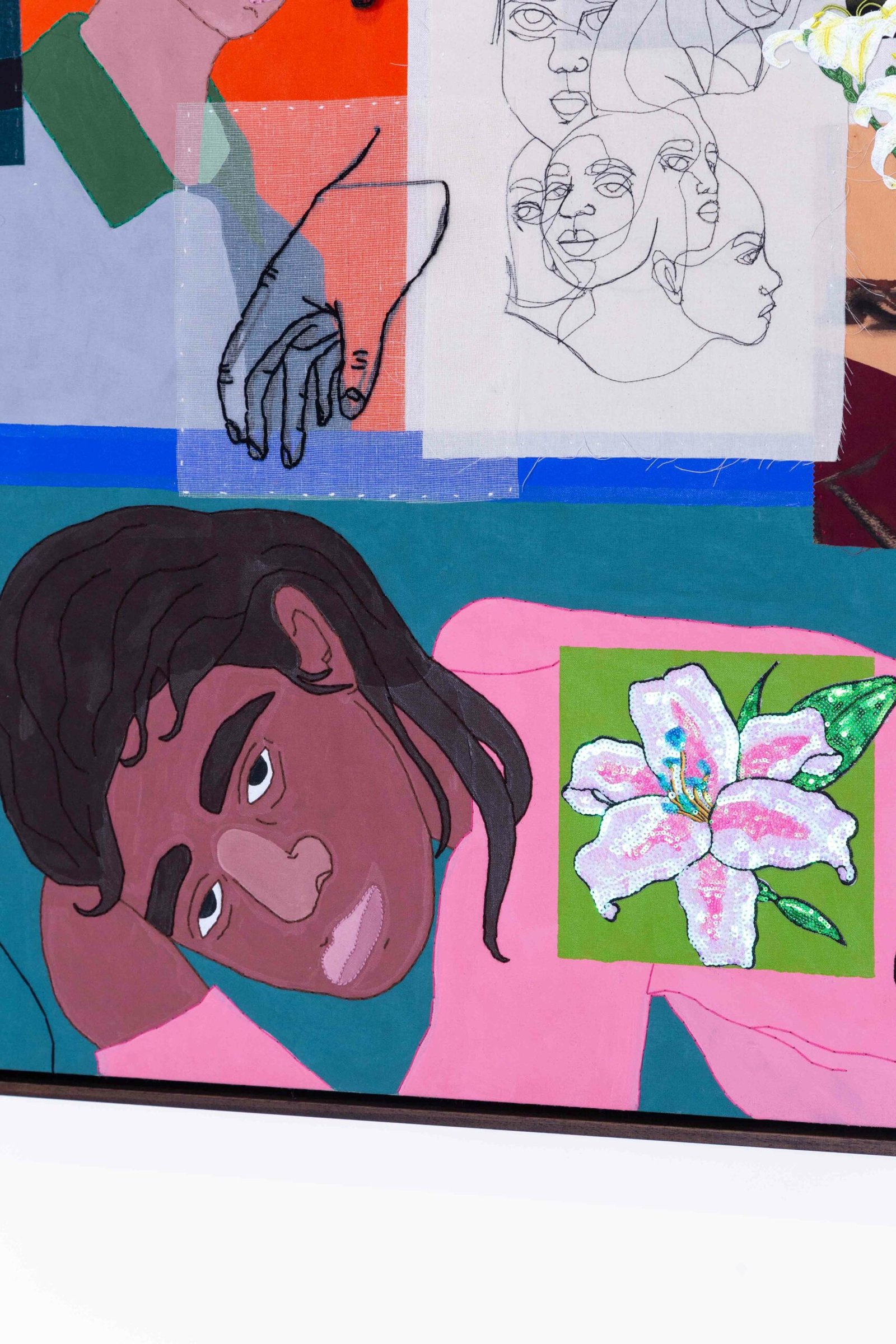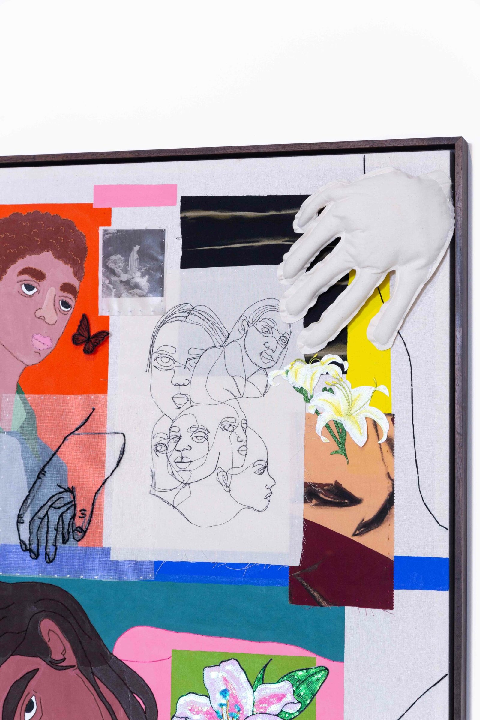 Collage-like acrylic painting, embroidery, printed photos on fabric, and reliefs made with batting and fabric.